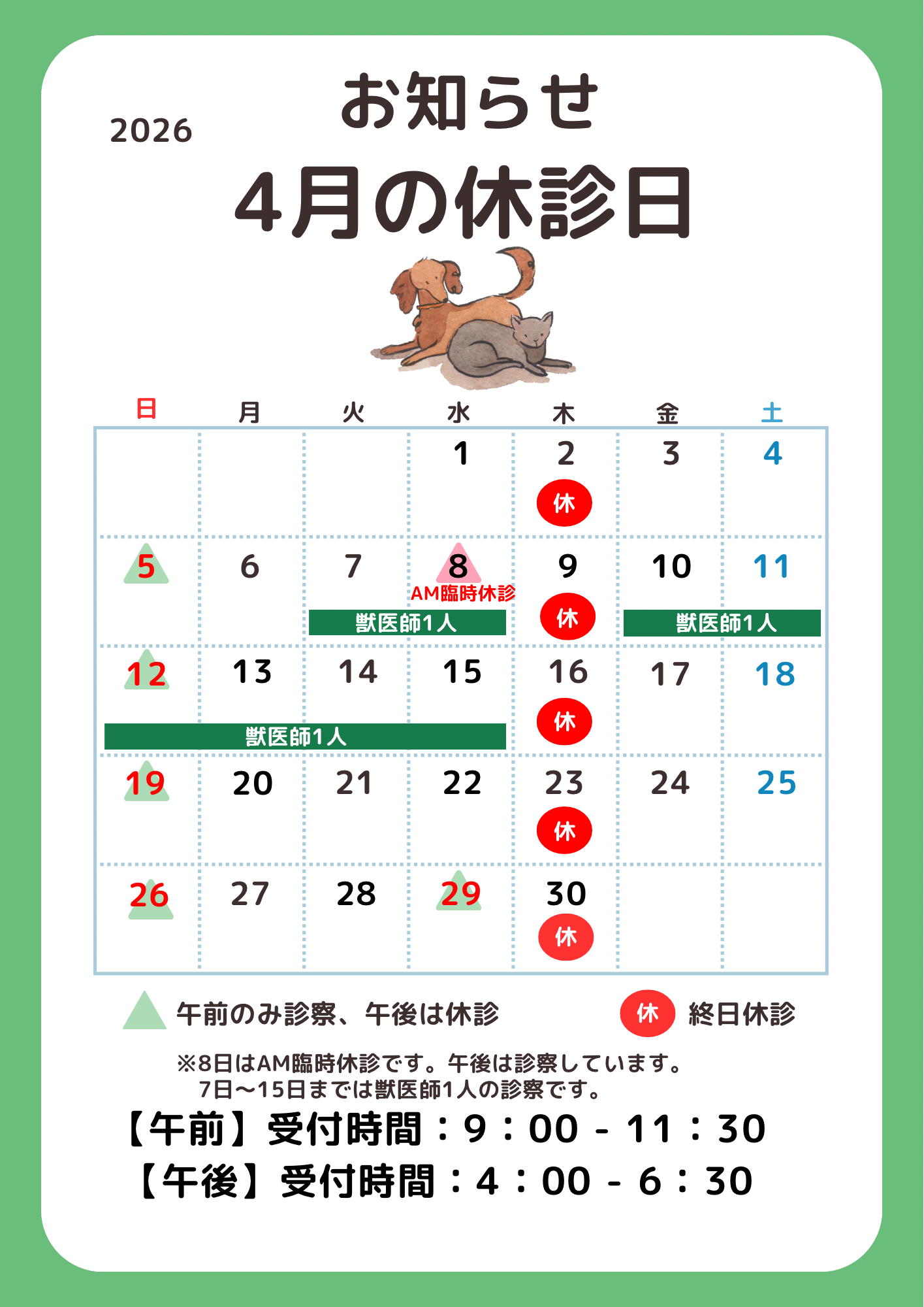 2026年4月の診察日のお知らせ